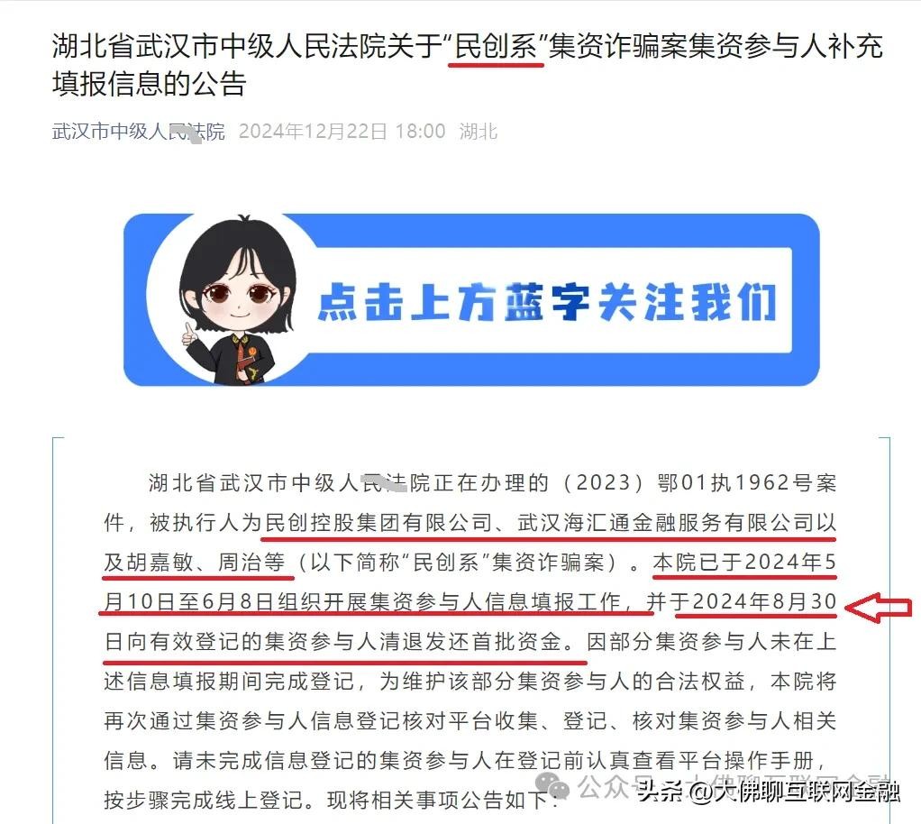 2024年12月22日、23日,分别发布“民创系”集资诈骗案和“中农财富”案集资参与人补充填报信息的公告。