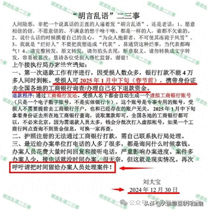 应该是2024年12月30日上午的消息,易通贷案的首次案款发放,预计在2025年1月中下旬时间可查询到账情况,估计是会在春节前。