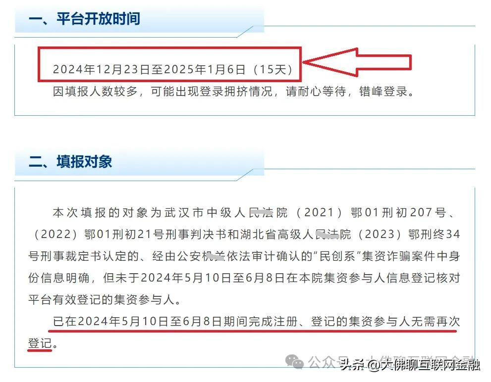 ①“民创系”诈骗案,案件在2023年6月19日二审宣判,2024年5月10日至6月8日第一次要求线上填报,同年8月30日进行了首次退赔,当时未公布具体金额及比例。此次补充登记自2024年12月23日至2025年1月6日止,为期15天。
