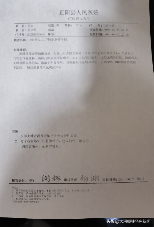 嫌疑人落网后,李崇才感觉肋部疼痛得厉害,但为了尽快带回嫌疑人,他强忍疼痛,和同事一起连夜从临沧市镇康县坐汽车长途跋涉800余公里到达昆明,然后转乘高铁;6月24日下午,抓捕组民警将两名犯罪嫌疑人安全带回正阳。 当天晚20时许,李崇才赶到正阳县人民医院进行检查,CT检查显示其右侧肋骨骨折,医生要求他必须尽快住院进一步治疗。