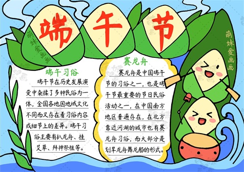 端午节,又称端阳节、龙舟节、重午节等,日期在每年农历五月初五,是集拜神祭祖、祈福辟邪、欢庆娱乐和饮食为一体的民俗大节。端午节与春节、清明节、中秋节并称为中国四大传统节日。2009年9月,联合国教科文组织正式批准将其列入《人类非物质文化遗产代表作名录》,端午节成为中国首个入选世界非遗的节日。今天萌妹老师给大家带来一组含文字内容的端午节手抄报及主题画合集,简单又漂亮,可收藏备用哦。