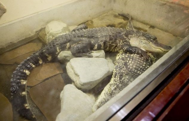 两只鳄鱼被关在在一个被扁平了的空间。