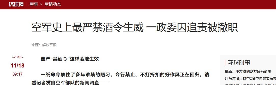 信源:解放军报【2016-11-18】《空军史上最严禁酒令生威 一政委因追责被撤职》