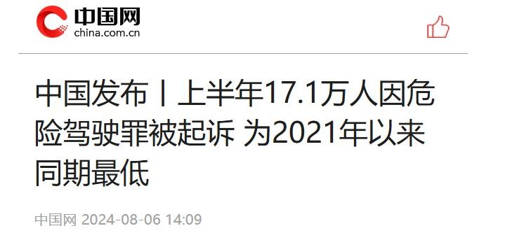 中国网【2024-08-06】《中国发布丨上半年17.1万人因危险驾驶罪被起诉 为2021年以来同期最低》