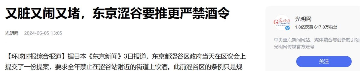 光明网【2024-06-05】《又脏又闹又堵,东京涩谷要推更严禁酒令》