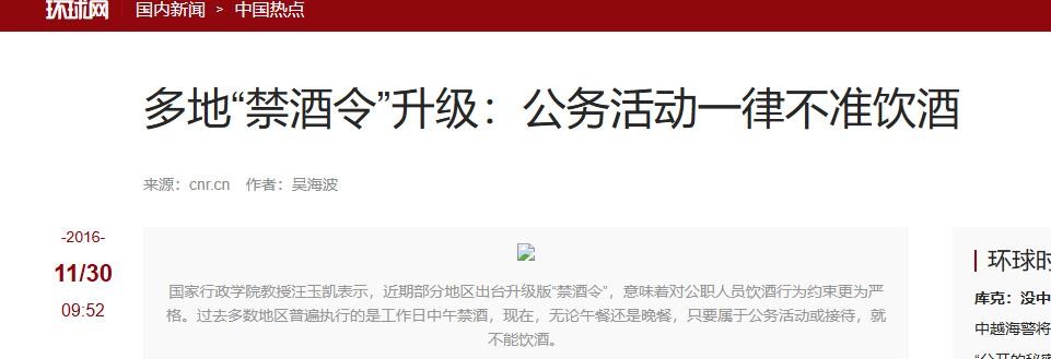 央广网【2016-11-30】《多地“禁酒令”升级:公务活动一律不准饮酒》