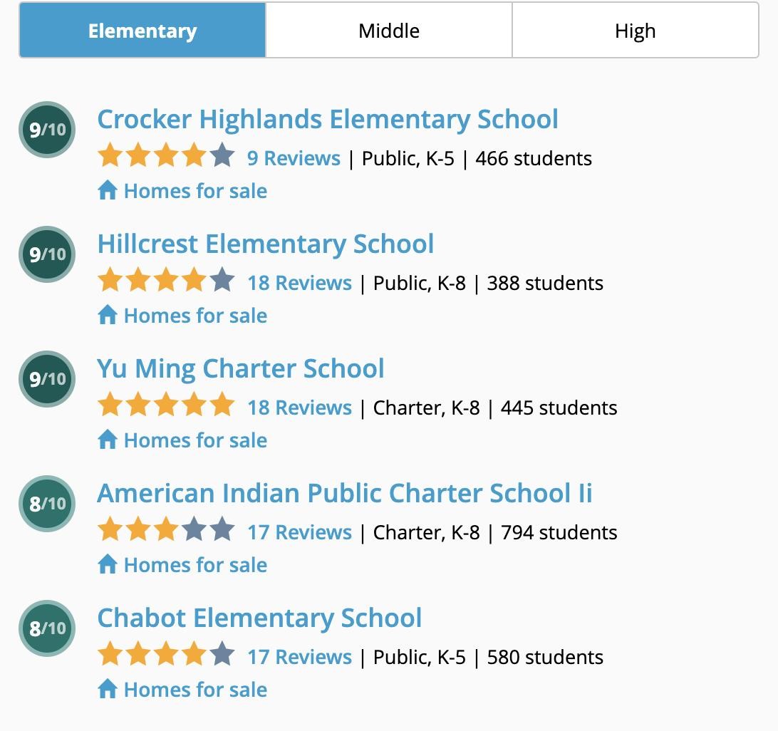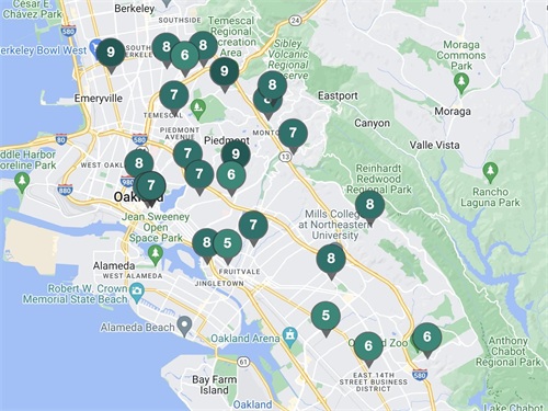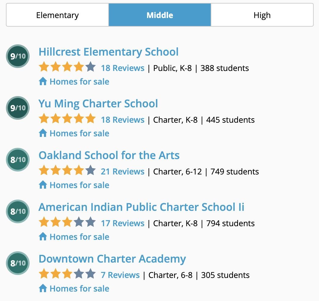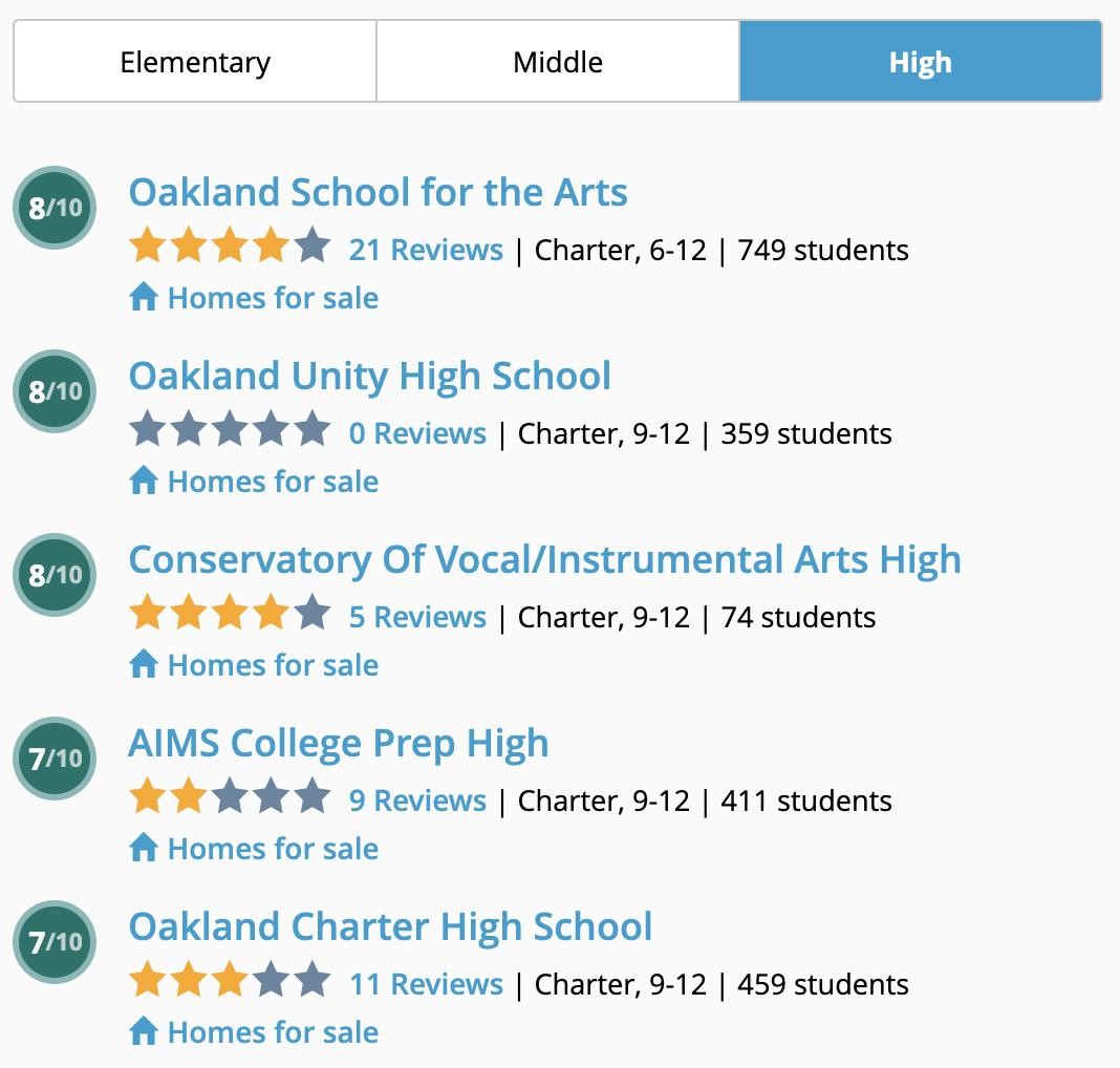 奥克兰学校评分分布。图片来自Great Schools