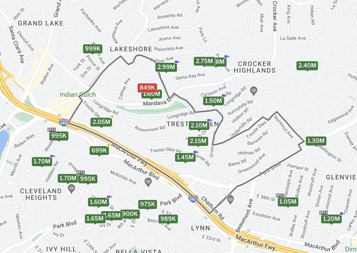 TrestleGlen社区属于非常好的社区,治安好,有很多豪宅,还拥有一所9分公立小学(Crocker Highlands Elementary School),对于重视子女教育的家庭可以作为一个备选项,房价中位数为210.2万美金。