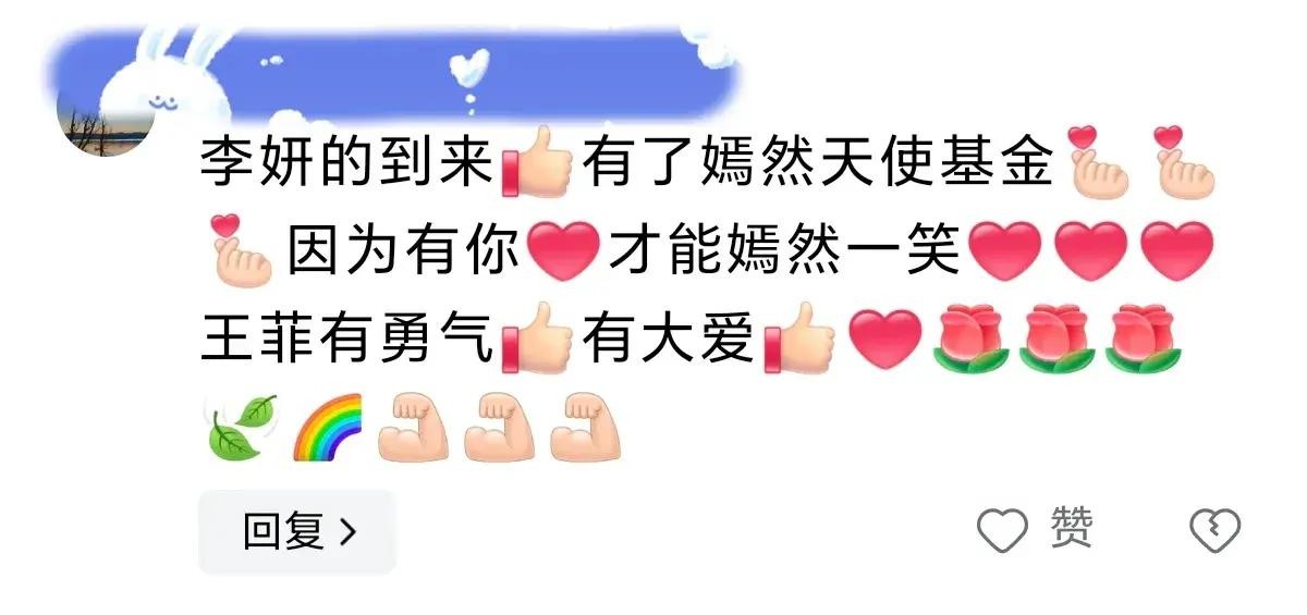 王菲和李亚鹏以女儿的名字"嫣"创立了"嫣然天使基金",旨在帮助更多先心病及唇腭裂病患儿童家庭渡过难关。李嫣从小就得到了父母充分的爱与呵护,也体会到了做公益的快乐,这都使她变得更加善良宽容。