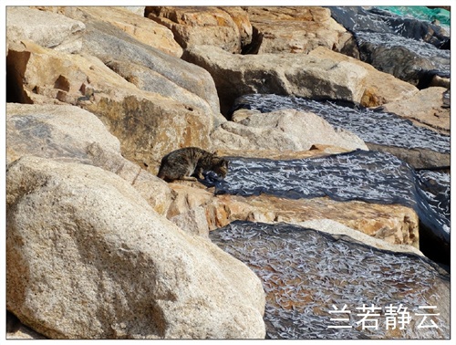岸边的礁石上渔民们在晒小鱼干,竟然发现有一只馋猫在偷吃!