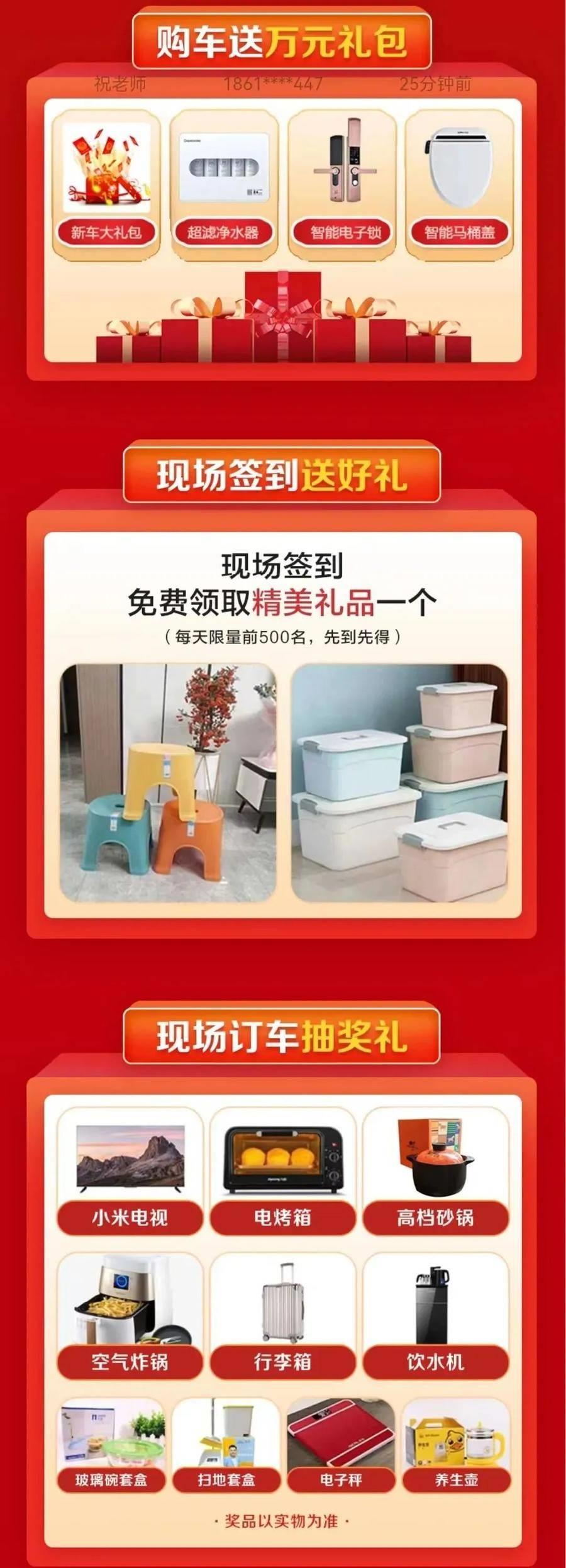 购车抽奖活动也会在活动现场持续进行,液晶电视、拉杆箱、电烤箱、空气炸锅等礼品让你拿到手软。