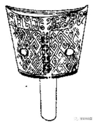 南方大铙兽面纹的另一种变形方式是以云雷纹铺底,加上部分立体的局部构件,如图4-9所见的铜铙,即是以方形勾连云纹作底,加上浮雕的双目。此种装饰手法看似极简,但钲部和鼓部由细密线条勾勒的云纹并非属于“地纹”概念,因为即便将双目去掉,我们仍能从云纹的布局和走向上辨别兽面形态,中轴线的存在也使提示了纹饰结构与具象饕餮纹的关联。类似纹样在饕餮纹中抽象程度较高,几何化色彩的进一步加深使饕餮形象几乎隐形,由此,商代最为典型的幻想动物纹饰在南方迥异的艺术表达中浮现出另一种神秘的面相。