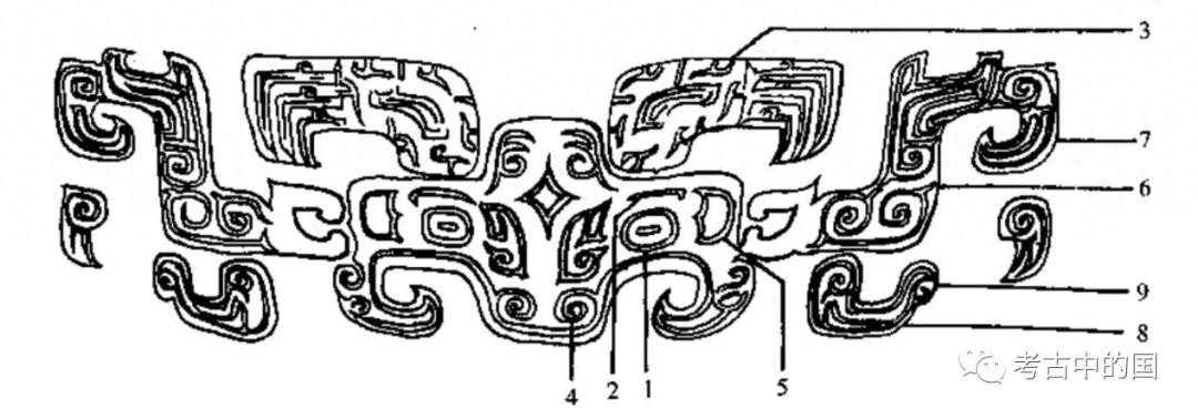 饕餮纹图形也经常会出现身、首分离的情形。通常的做法是将兽形躯干和腿、足等构件拆解并分布到兽首的两侧,如图2-5所示,这种布局方式,可以进一步放大兽首的比例,并使兽首在充满装饰面的同时仍能保持兽形结构的相对完整。除了将饕餮的身、首分离,有时饕餮头部的各构件也会被分解,也就是前文提到过的分解式。如图2-6所示纹样,几乎每一个构件都相互分离,这种手法增大了底纹的可见面积,使器表在虚实相生间呈现出轻盈灵动的质感。