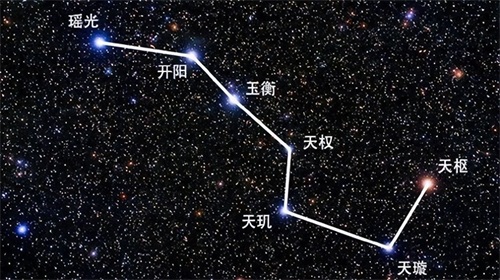 北斗七星在不同的季节和夜晚不同的时间,出现于北半球天空不同的方位,古人就根据初昏的时候,斗柄所指的方向来决定季节: