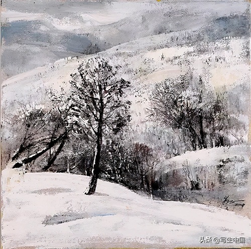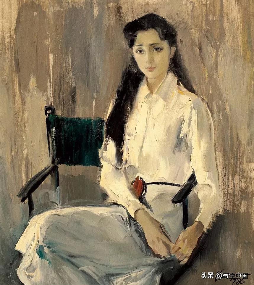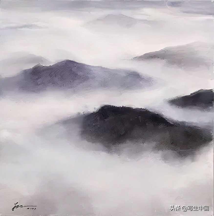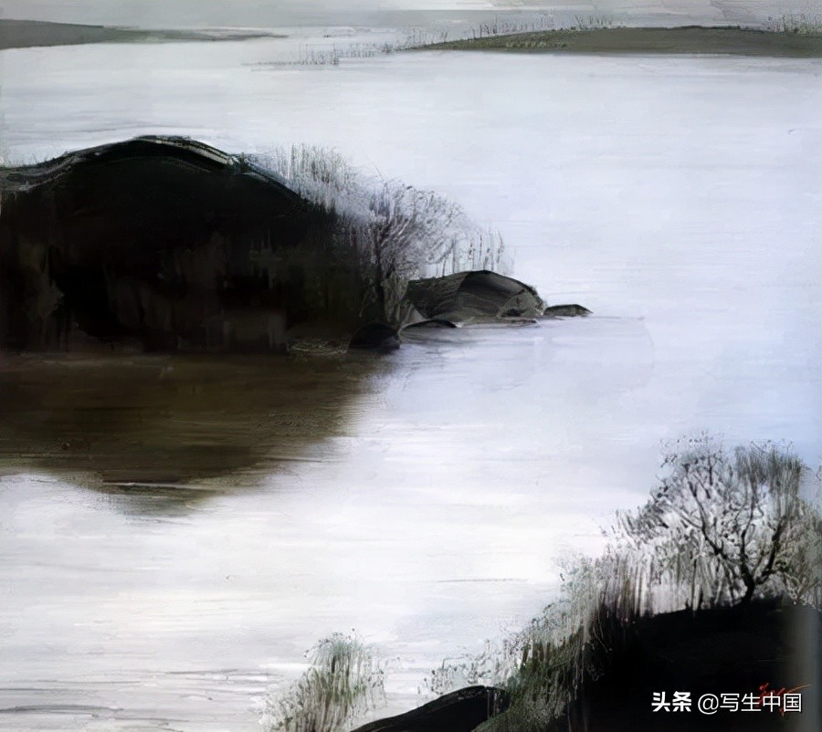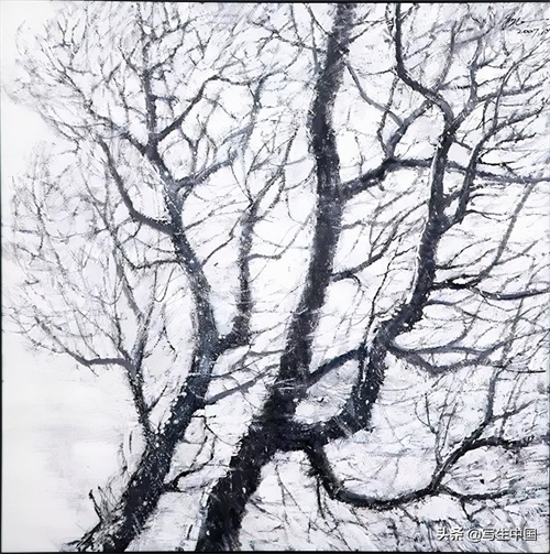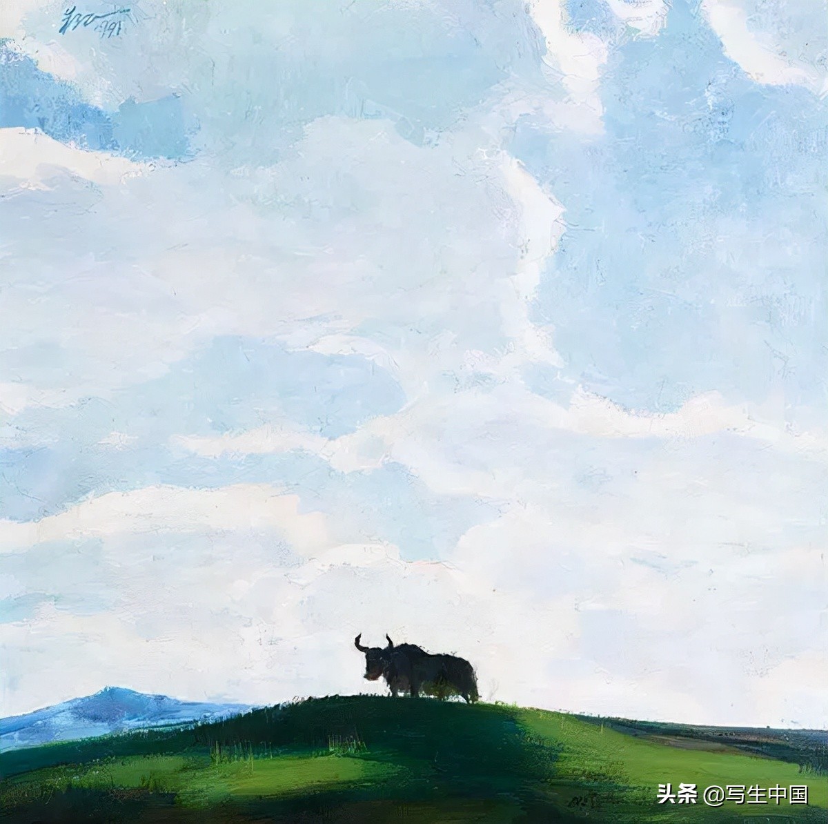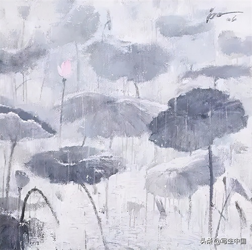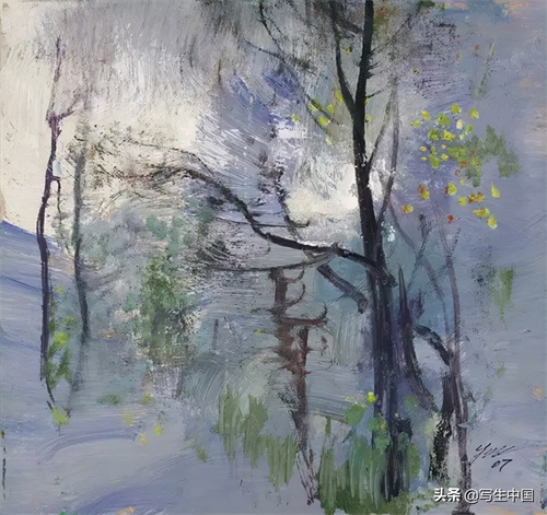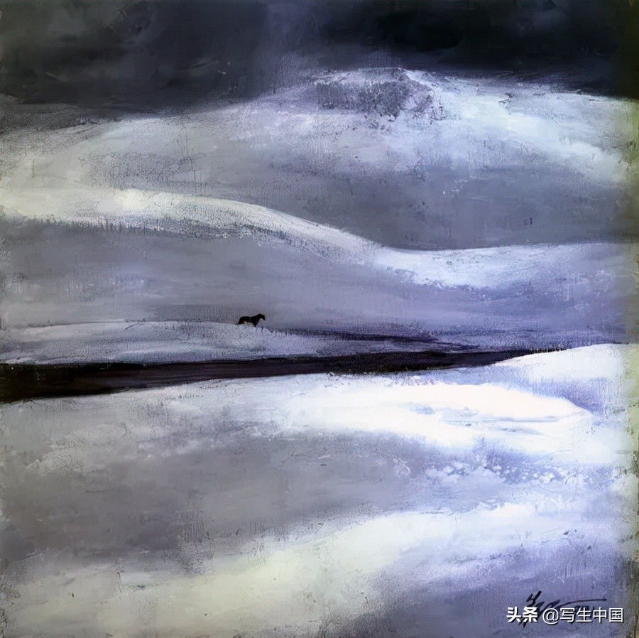 笔势流动,线条抒情。黑白点面突出、画面响亮明快。用中国毛笔直接画油画,视觉上拉近了油画与中国画的距离。