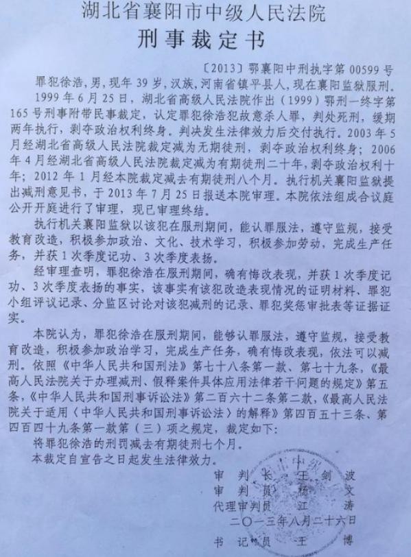 尽管徐浩并非主犯,但在1999年,法院判处了他死刑,缓期两年执行。徐浩及其家人对判决表示不服,但湖北高院维持了原判。