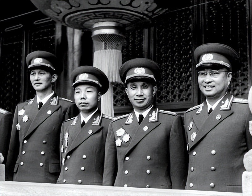 1955年10月1日,身着55式礼服在天安门城楼观礼的陈赓大将(右起)、粟裕大将、肖华上将、洪学智上将。