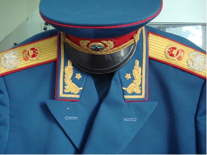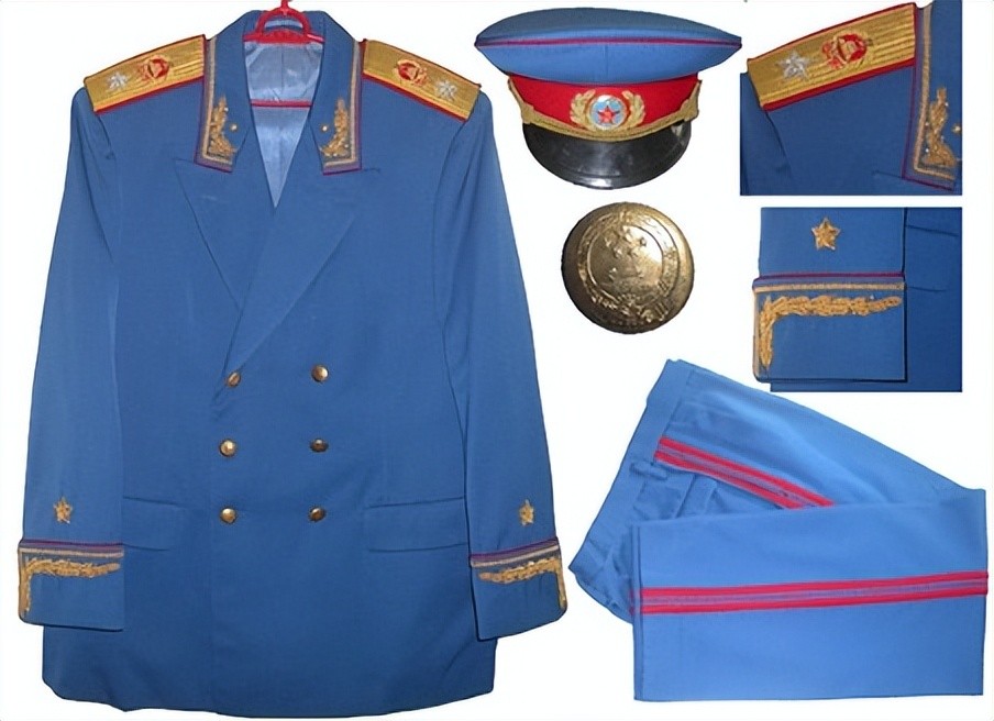 陆、海、空军将军礼服 大檐帽帽顶陆、空军为海蓝色,海军为藏青色。帽墙和帽瓦上、下边缘牙线,陆军正红色,海军白色,空军天蓝色。陆、海、空军将军的礼帽均有金属丝帽带,金黄色帽钉,帽徽周围绣金色松枝叶,黑色帽檐。礼服样式与元帅礼服样式同。颜色按军种区分:陆军为海蓝色,海军为藏青色,空军为海蓝色。领边、袖头、裤中缝有军种色牙线,陆军正红色,海军白色,空军天蓝色。裤中缝两边镶正红色饰条。礼服的领边、袖头绣金线一道和金色松枝叶,左、右领头绣金色五角星。