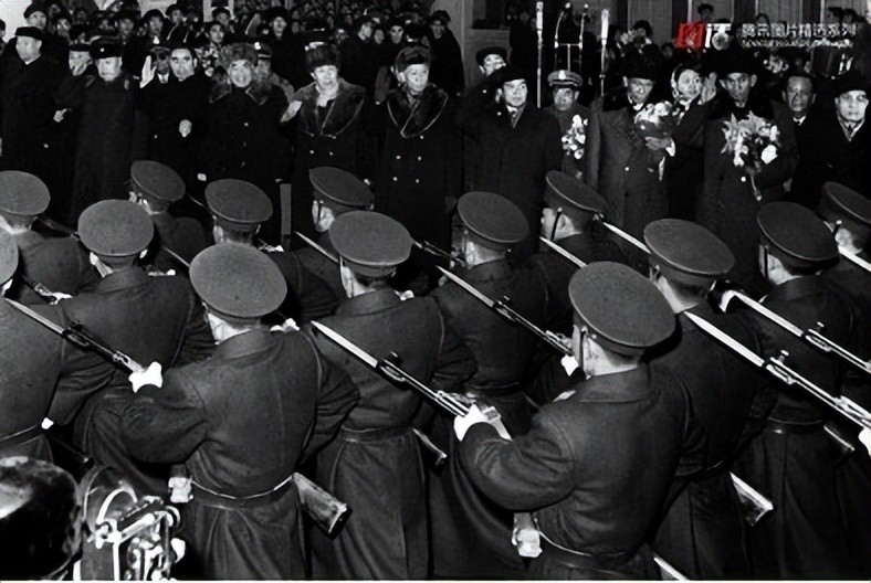1960年12月15日,柬埔寨国家元首诺罗敦·西哈努克亲王抵达北京。仪仗队员外穿大衣,但仍戴大檐帽。