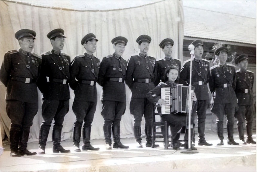 70年代解放军军乐团团员,他们穿的毛料服是55式文工团演出服(礼服),肩上佩戴肩章用的肩袢清晰可见。