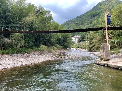 记住【西林村】。在这个牌子的对面,就是吊桥和小溪。
