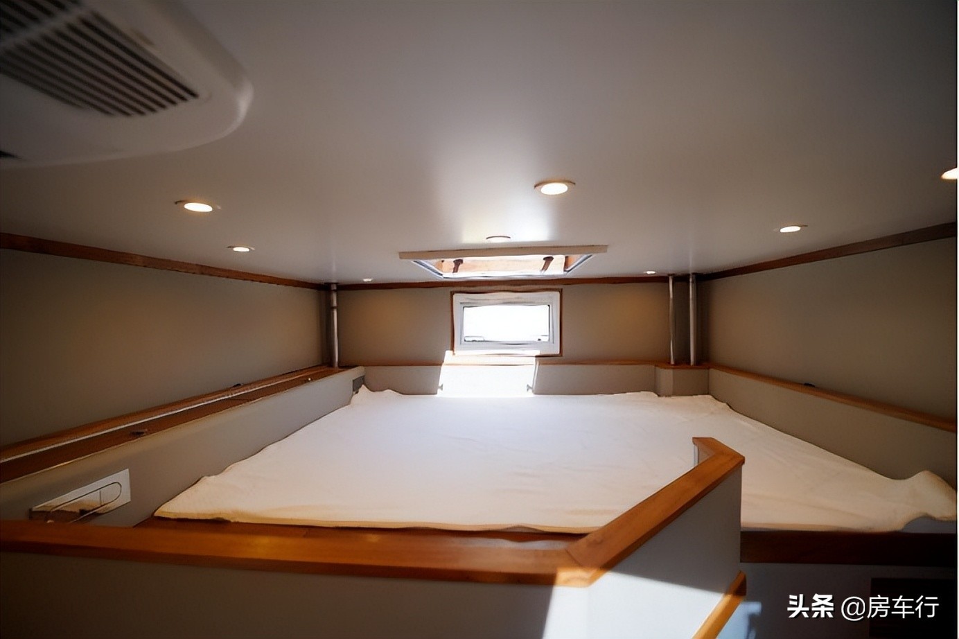 驾驶舱与生活区之间采用通舱软连的贯通设计;内饰提供了柚木、橡木、胡桃木、桃花心木等多种风格可供选择;会客区真皮软包式对卡座+气动升降式餐桌(可拼床)可供四人乘坐休息;尾部上下横床的设计可满足多人夜间睡眠的需求;尾床顶部预留上桥大仓口,选装电动液压全景升降天台后,还能通过仓口(或驾驶舱侧方爬梯)进入天台。