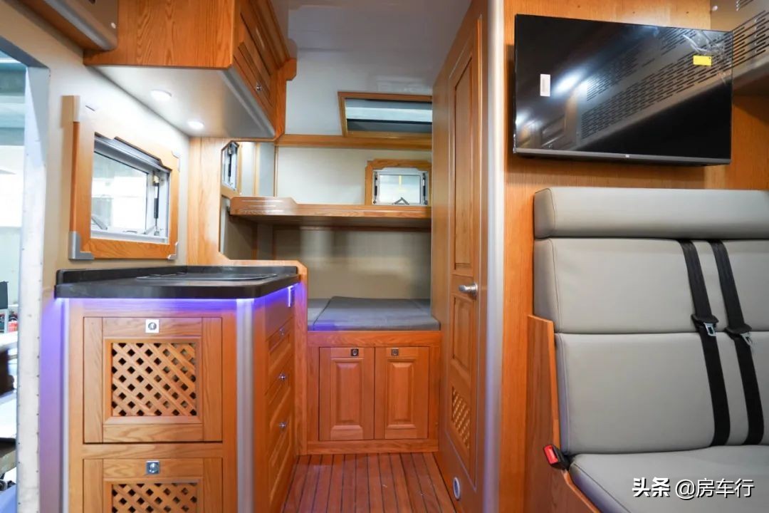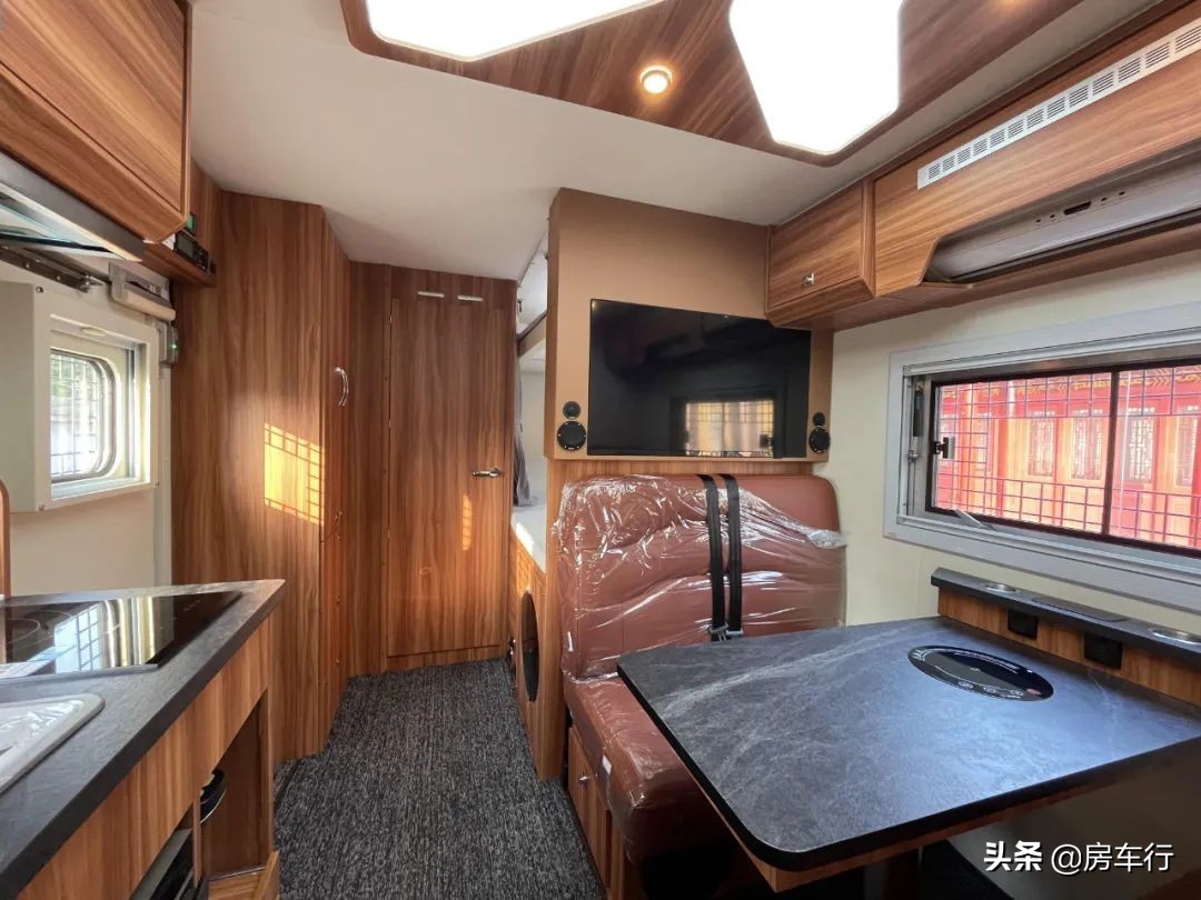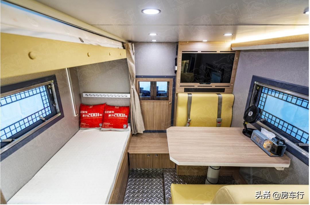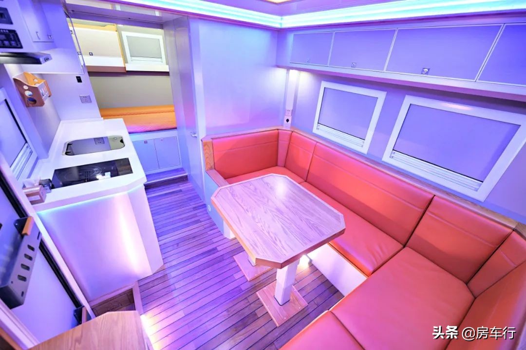 厢体空间虽有限,但这款车却是将空间利用到了极致;超大的卫浴区,四人对卡座可拼床,顶部还有一张升降吊床;厨房区丰富的烹饪设施以及超大的操作台面,让车内烹饪轻松搞定。