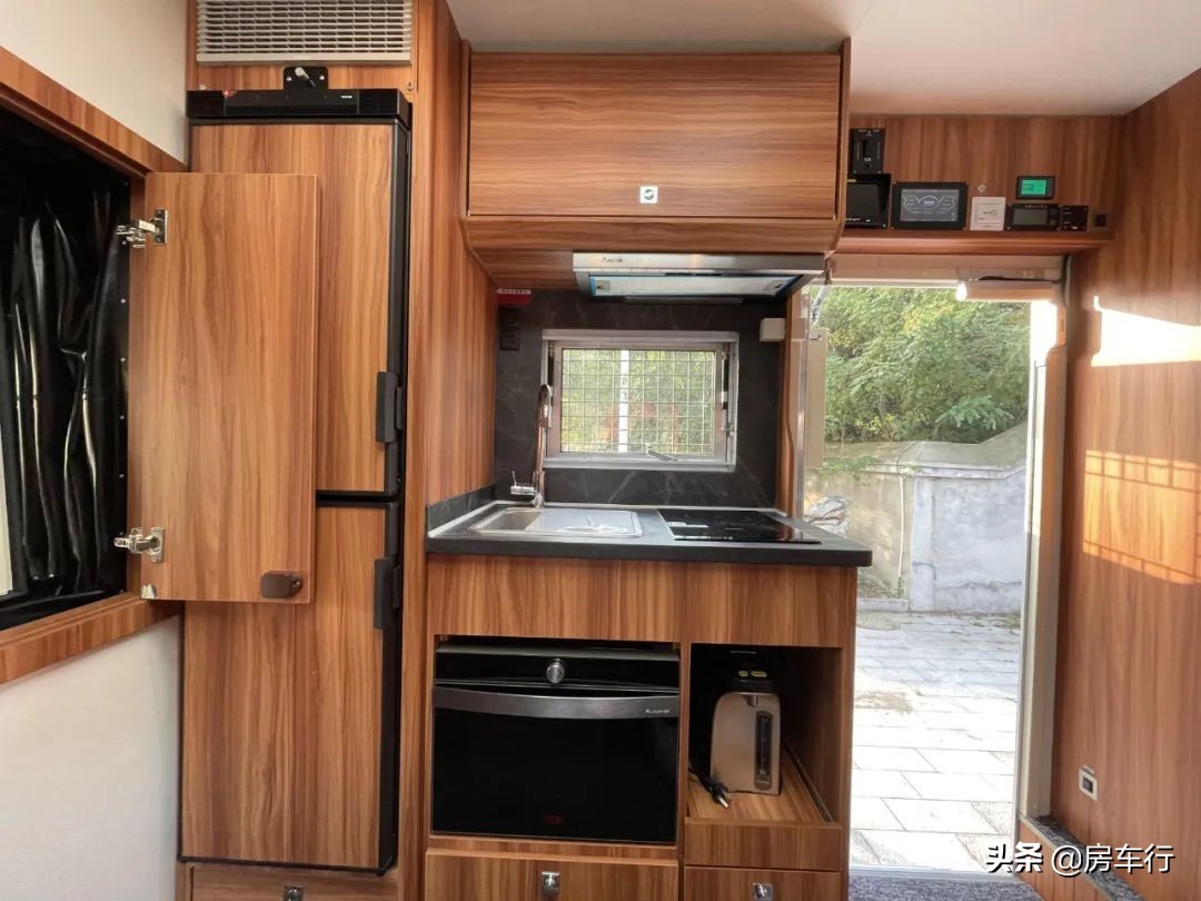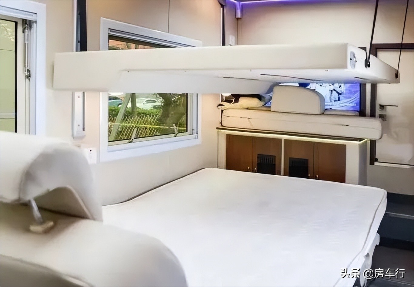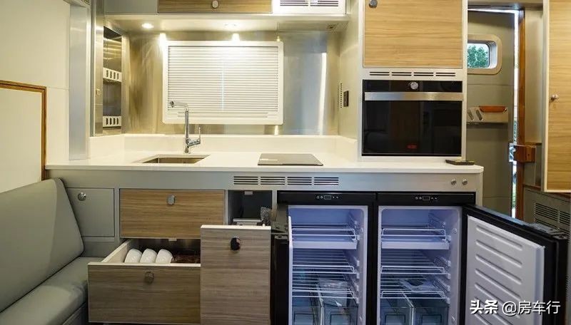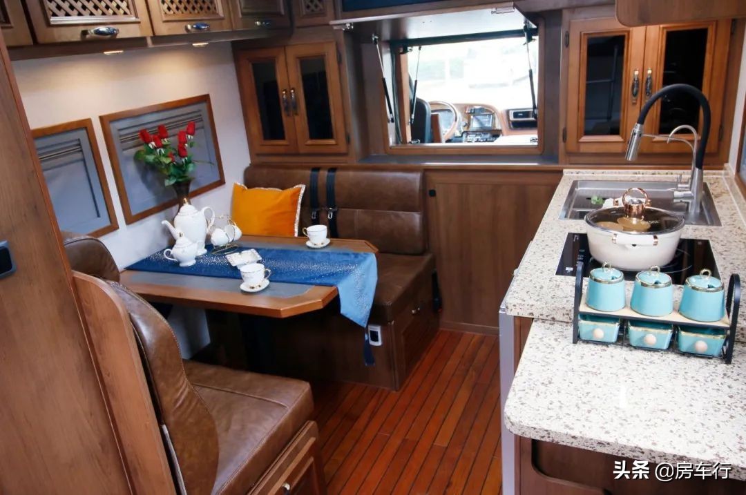 厢体空间虽有限,但这款车却是将空间利用到了极致;超大的卫浴区,四人对卡座可拼床,顶部还有一张升降吊床;厨房区丰富的烹饪设施以及超大的操作台面,让车内烹饪轻松搞定。