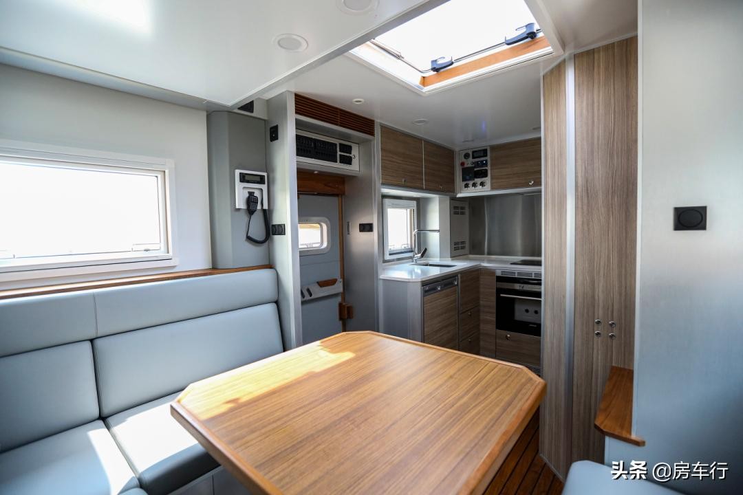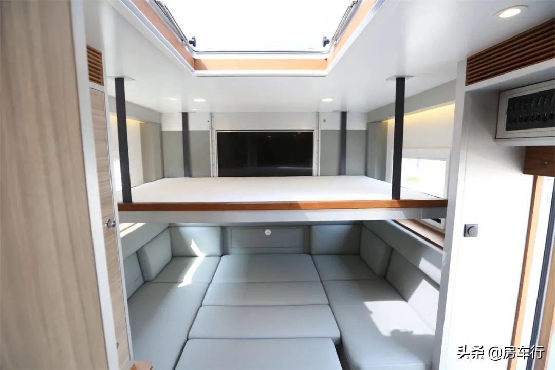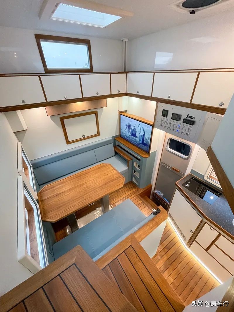 生活区采用船用级柚木地板,并且经过植物油抛光,质感更丰富;布局方面设置了会客区、厨房区、干湿分离卫浴区,固定休息区位于二层,驻车升顶后即可使用,内部设有两张床位,搭配可拼床的对卡座,整车共有三张床,睡眠空间充足。