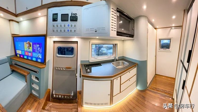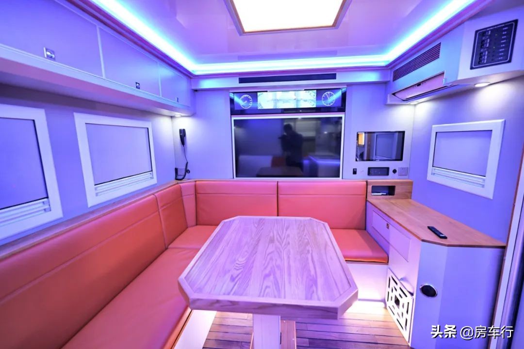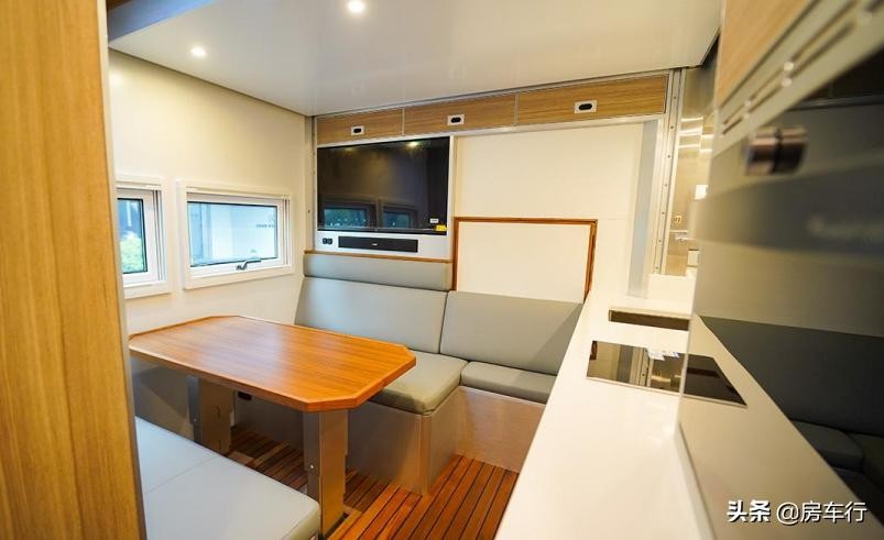 生活舱的内饰豪华不失温馨;通舱软连接设计,舱口下方设有隐藏的电动升降式电视;前部会客区设有环形大卡座,进口超纤软包,搭配房车专用双电动支腿升降餐桌还能拼成一张大床;后方是厨房区、独立洗手间以及尾置横床。