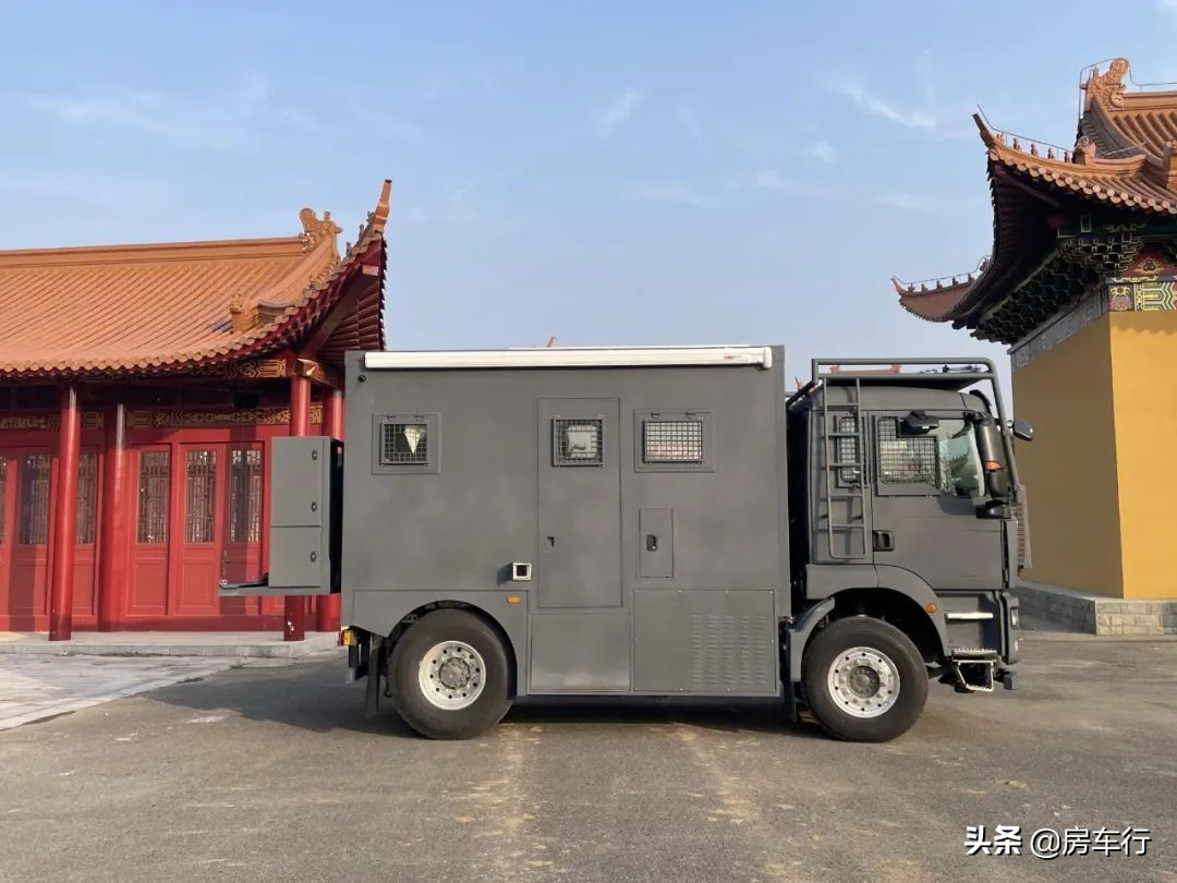 这款车是基于德国MAN4x4底盘打造的硬升顶越野房车,四驱三把锁,给你探索远方的底气;车身外尺寸为5995x2405x3680mm,搭载6.9T柴油涡轮增压发动机,匹配12速手自一体变速箱,最大功率213kW,峰值扭矩1150N·m。