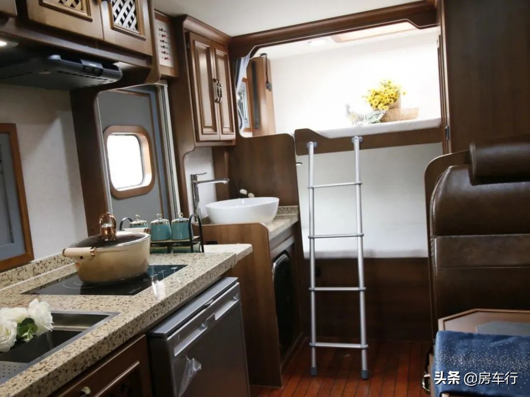 内饰部分精装设计,整体看起来典雅温馨;前方四人对卡座可拼床,隐藏式升降电视满足影音娱乐需求;外置洗漱池底部内嵌一台洗衣机,节省卫浴间空间的同时,也便于日常使用;尾部横置上下铺,上铺可翻折,并能通过上铺直达二楼露台。