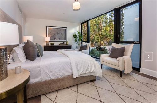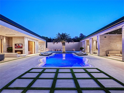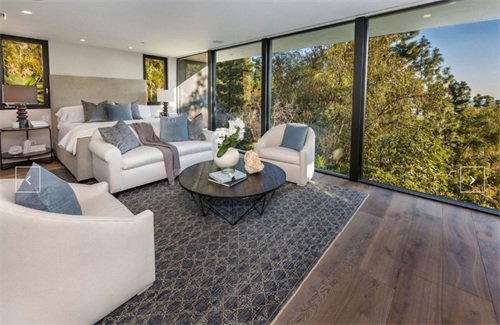 它可以俯瞰洛杉矶,拥有四间带大步入式衣柜的卧室,毛绒绒的客厅,以及一个巨大的泳池区,泳池的四面都有高大的树木保护着奶油色的日光浴椅。