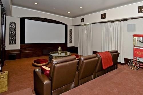 家里的电影院有软垫座椅和躺椅,还有一整面墙的巨大电影屏幕。