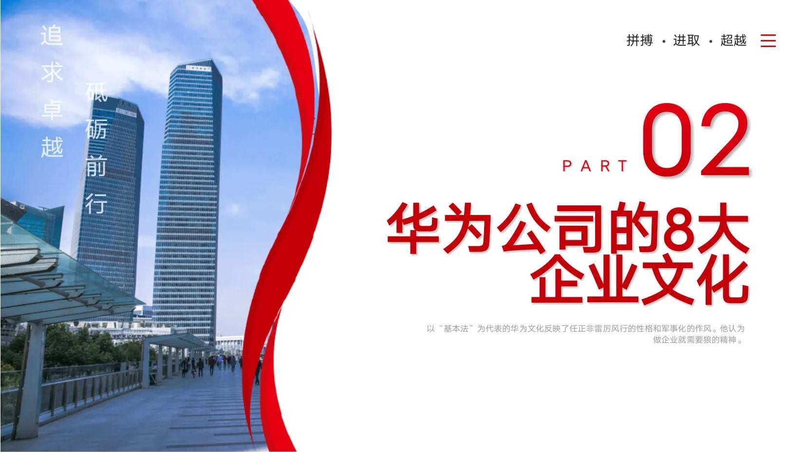 华为的企业文化独具特色,强调持续创新、客户至上和团队合作。公司倡导奋斗精神,鼓励员工不断超越自我,追求卓越。同时,华为注重员工成长,提供广阔的职业发展空间,打造和谐的工作环境。