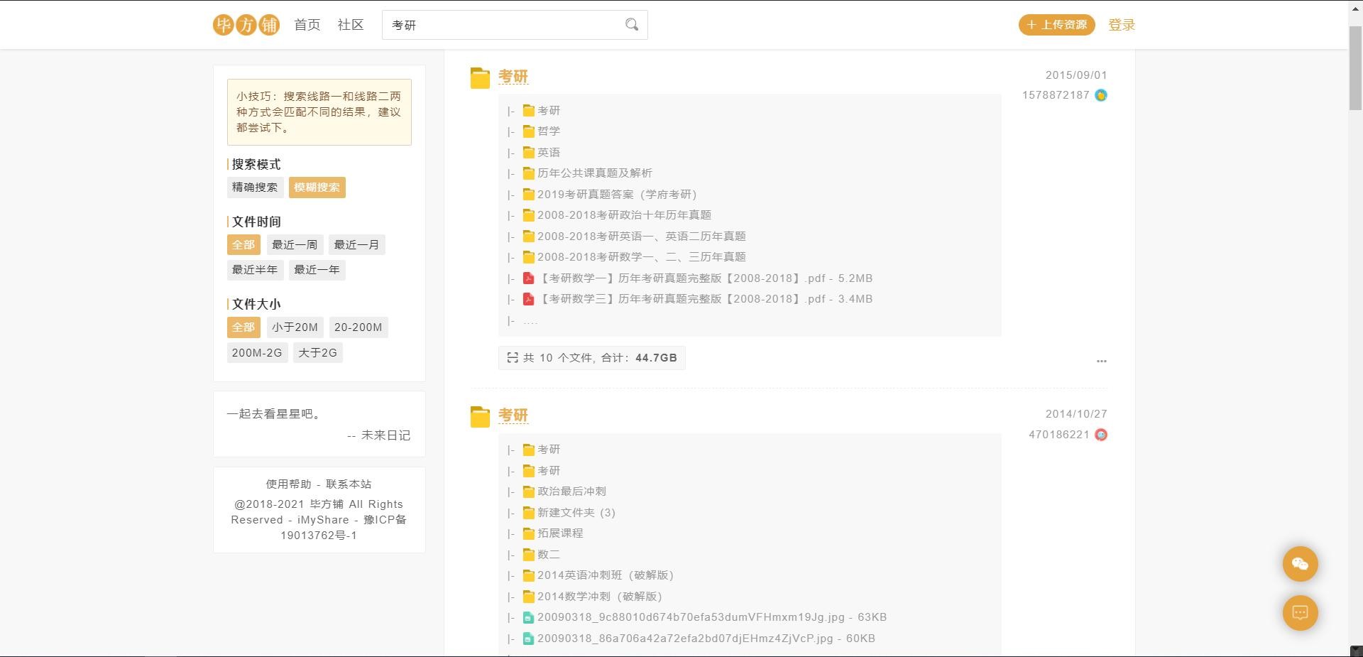 界面非常漂亮,资源更新也很快,几乎都是最新的资源,而且非常全面。可以选择模糊搜索,也能精准搜索,同样支持选择文件的上传时间以及大小