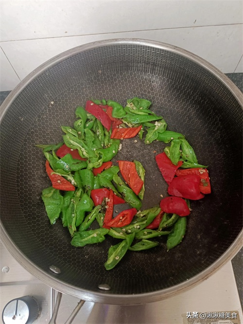 ③ 最后,再加入青椒和红椒,翻炒1分钟左右,撒上适量鸡精,翻匀即可出锅。
