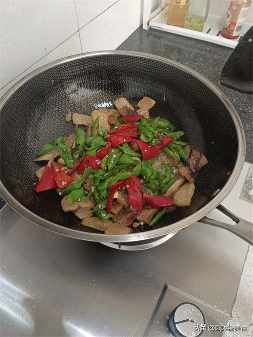 ①先把腊肉下锅煮至8、9分熟,然后捞出来沥干水,切片备用。青椒和红椒切小块(喜欢辣一点可以配上小米辣更香)然后先把辣椒不放油炒香放一点盐起锅备用