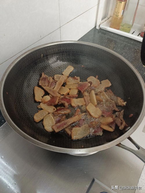 ② 接下来,在锅里加热少量油,放入腊肉在中火下翻炒,等到肥肉微微发干时,把配料一起下锅翻炒。