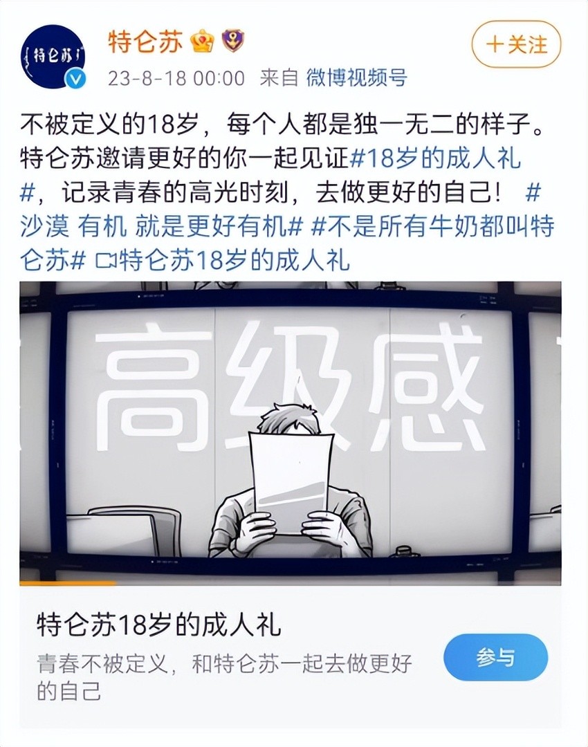 从营销层面上说,品牌以18岁的特仑苏和消费者一起见证18岁的成人礼为广告内核,建立起品牌与消费者的情感连接,无形中强化的是用户对品牌的好感度。