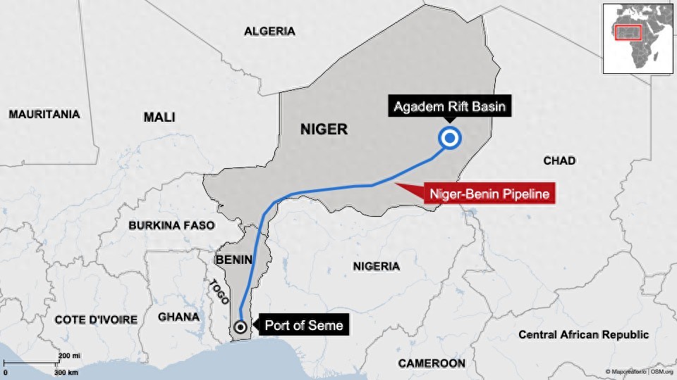 中石油建成运营的尼日尔-贝宁原油外输管道地图,图源:北京日报