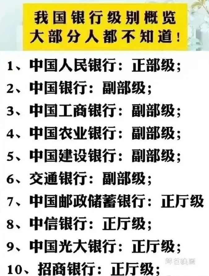 国有性质的股份制银行:如中信银行、光大银行、招商银行、浦发银行、华夏银行、兴业银行、广发银行、渤海银行、浙商银行、恒丰银行也属于正厅局级机构。