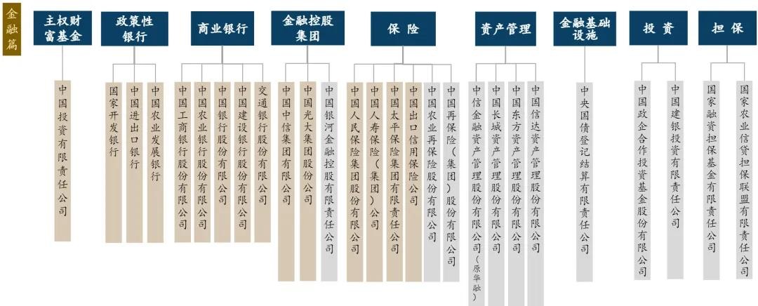 根据行业分,27家企业涉及银行有8家,即“五大行”+3家政策性银行;保险公司6家;金融资产管理公司4家(包括原中国华融,现名中信金资);金融控股集团3家;担保公司和投资类金融央企各2家;另有1家主权财富投资基金和1家金融基础设施公司。