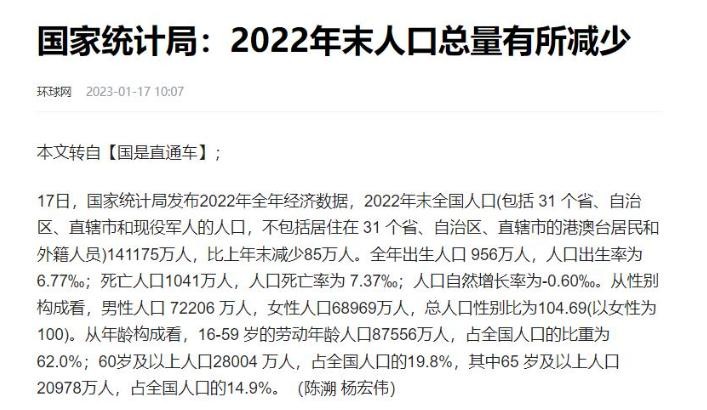 环球网,国家统计局:2022年末人口总量有所减少