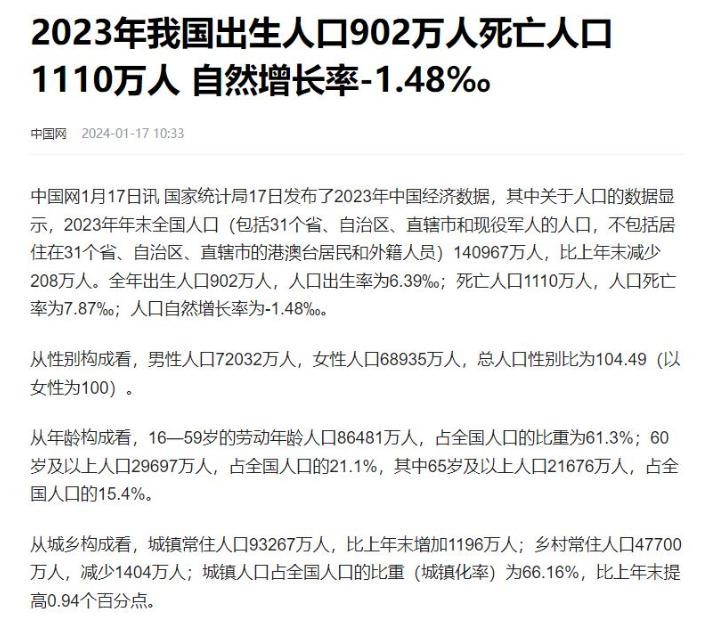 中国网:2023年我国出生人口902万人死亡人口1110万人 自然增长率-1.48%。