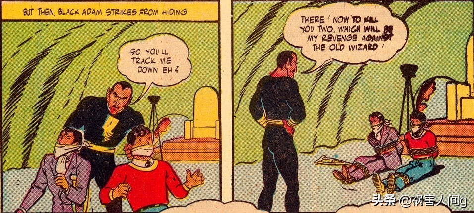 趁着神奇队长和小神奇队长变成普通小孩的时候,黑亚当将他们两抓住,并堵住了嘴防止他们念出咒语,绑住了他们的四肢。
