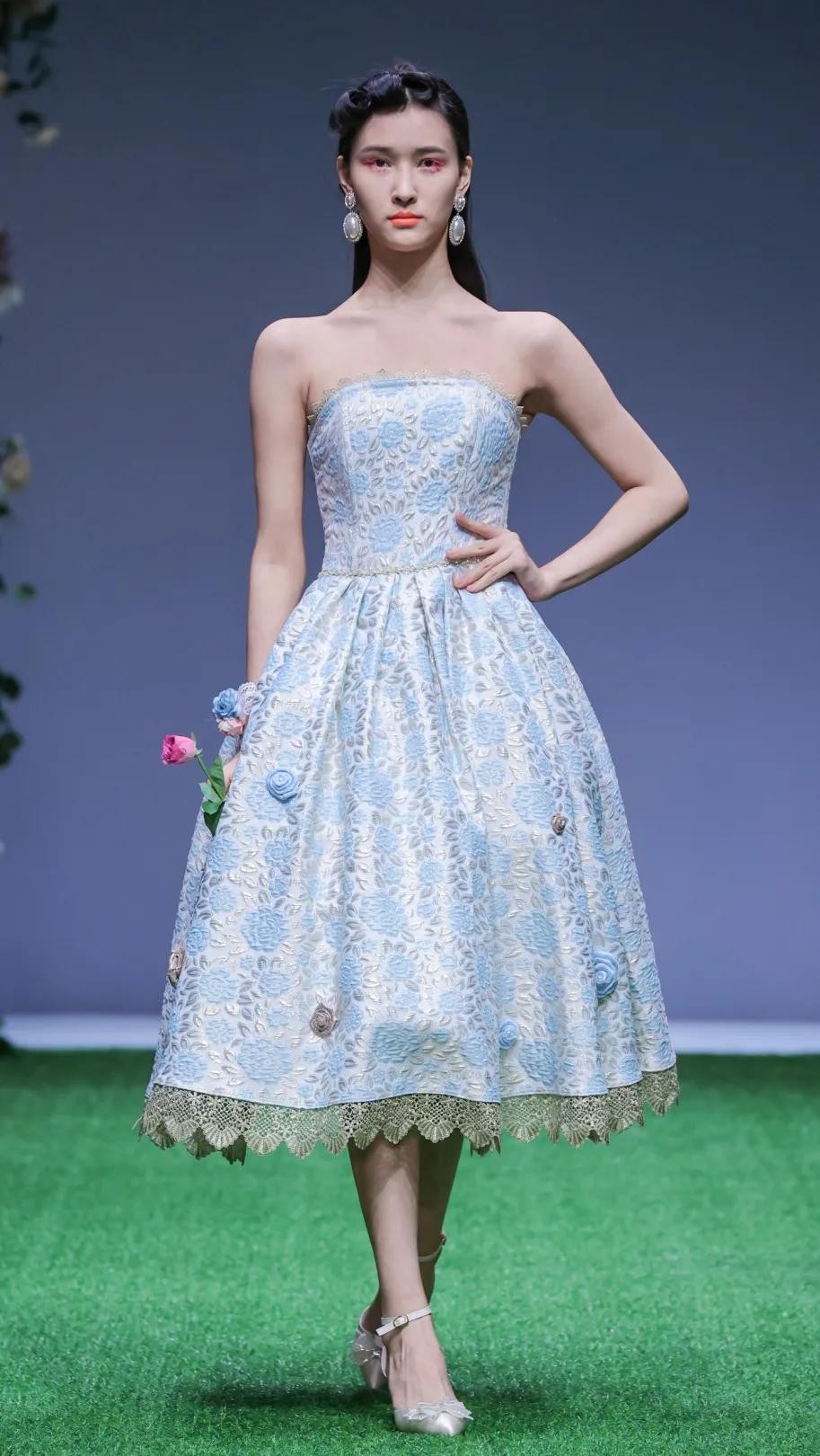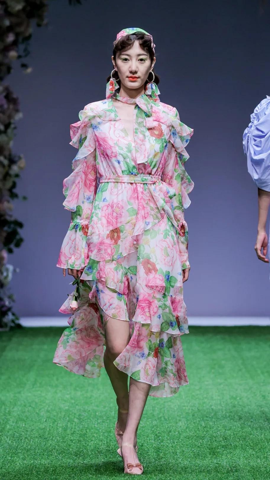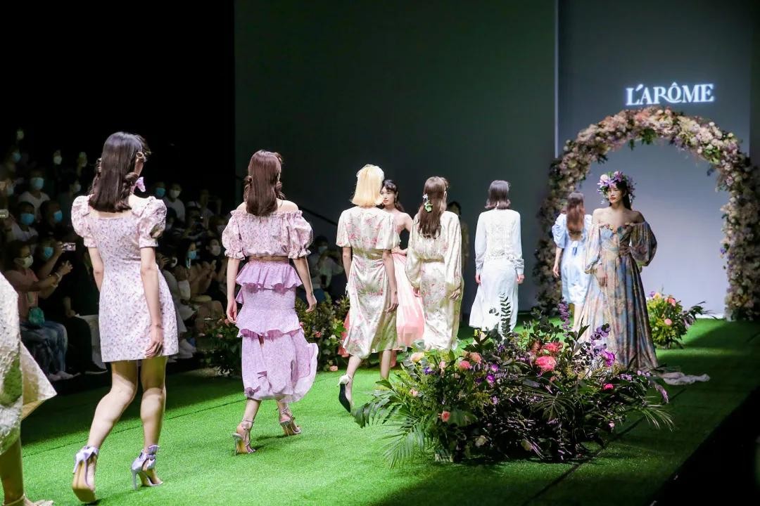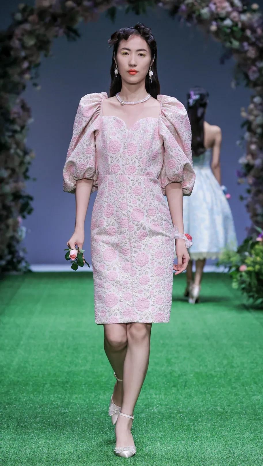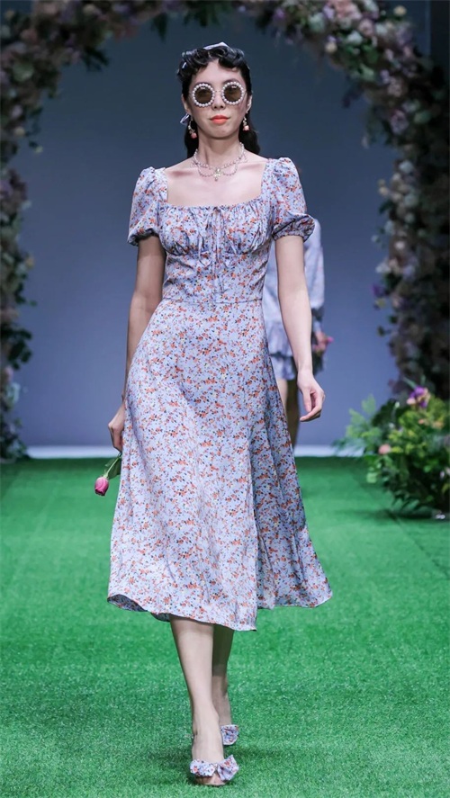 乐欧幕则打造了一系列复古着装,本季以“秘境花园”为主题,丝巾头饰、耳饰的搭配,以及服饰上提花、印花,搭配荷叶边、复古泡泡袖的装饰,颇有一种英式庄园的感觉,诠释复古浪漫。