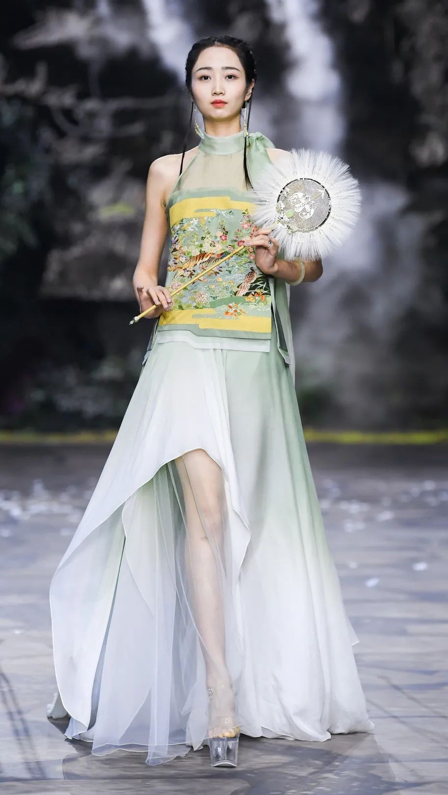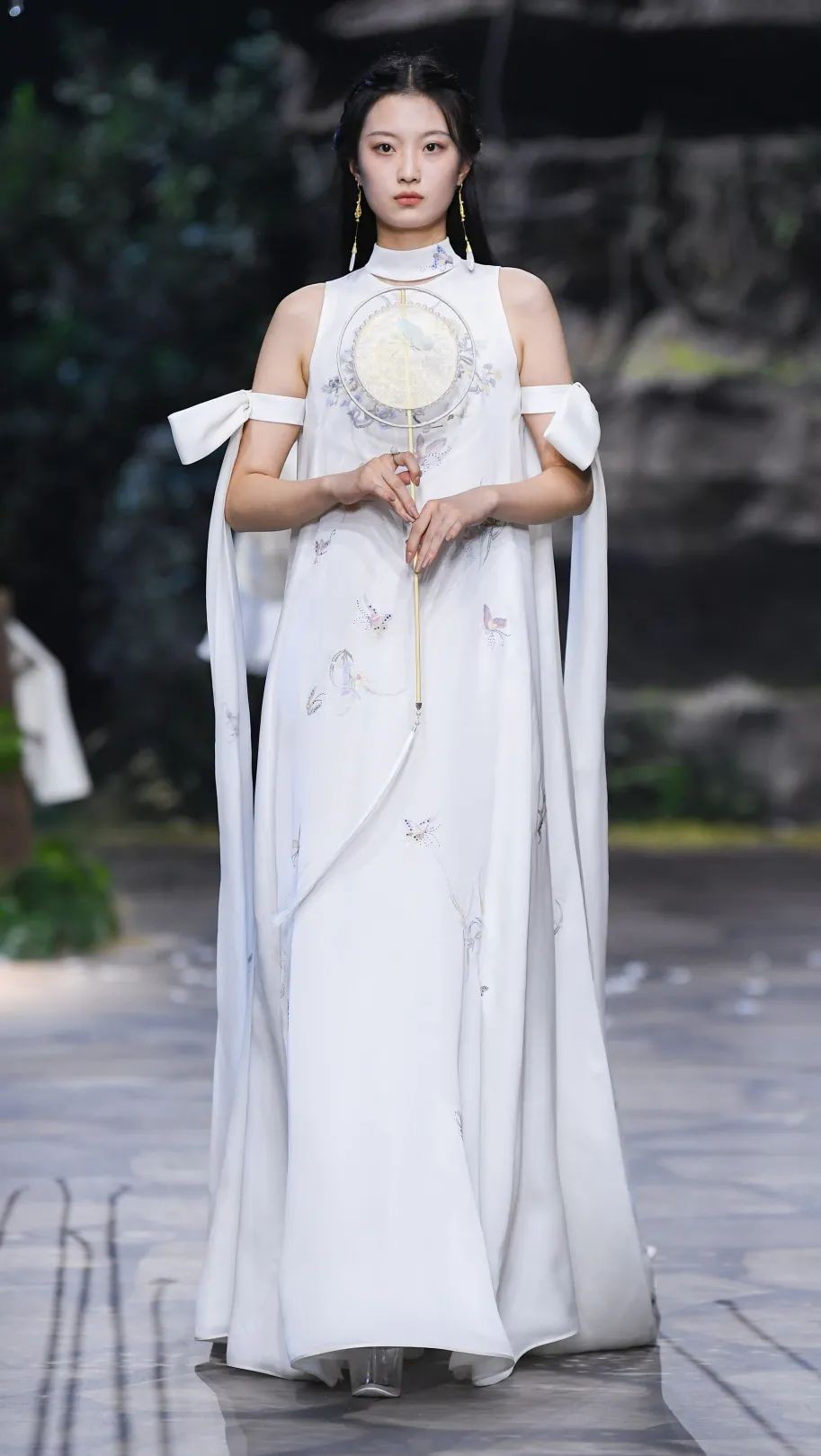 盖娅传说擅长打造概念化的秀场,本季再次斥巨资打造一个原生态的自然展示空间,山泉、瀑布、花鸟、兔子、蝴蝶、织布机,所有的一切都是真实的,自然的,在走秀的时候还有蝴蝶纷飞。春晚那场亮相绝对是对盖娅传说最大的误解。或许有受到外界评论的影响,本季盖娅传说在廓形上更多采用中国古代服饰廓形,团扇等配饰搭配更添古韵,当然,西式的剪裁同样必不可少。它尽管主打国风设计,但在设计上还是中西结合居多。