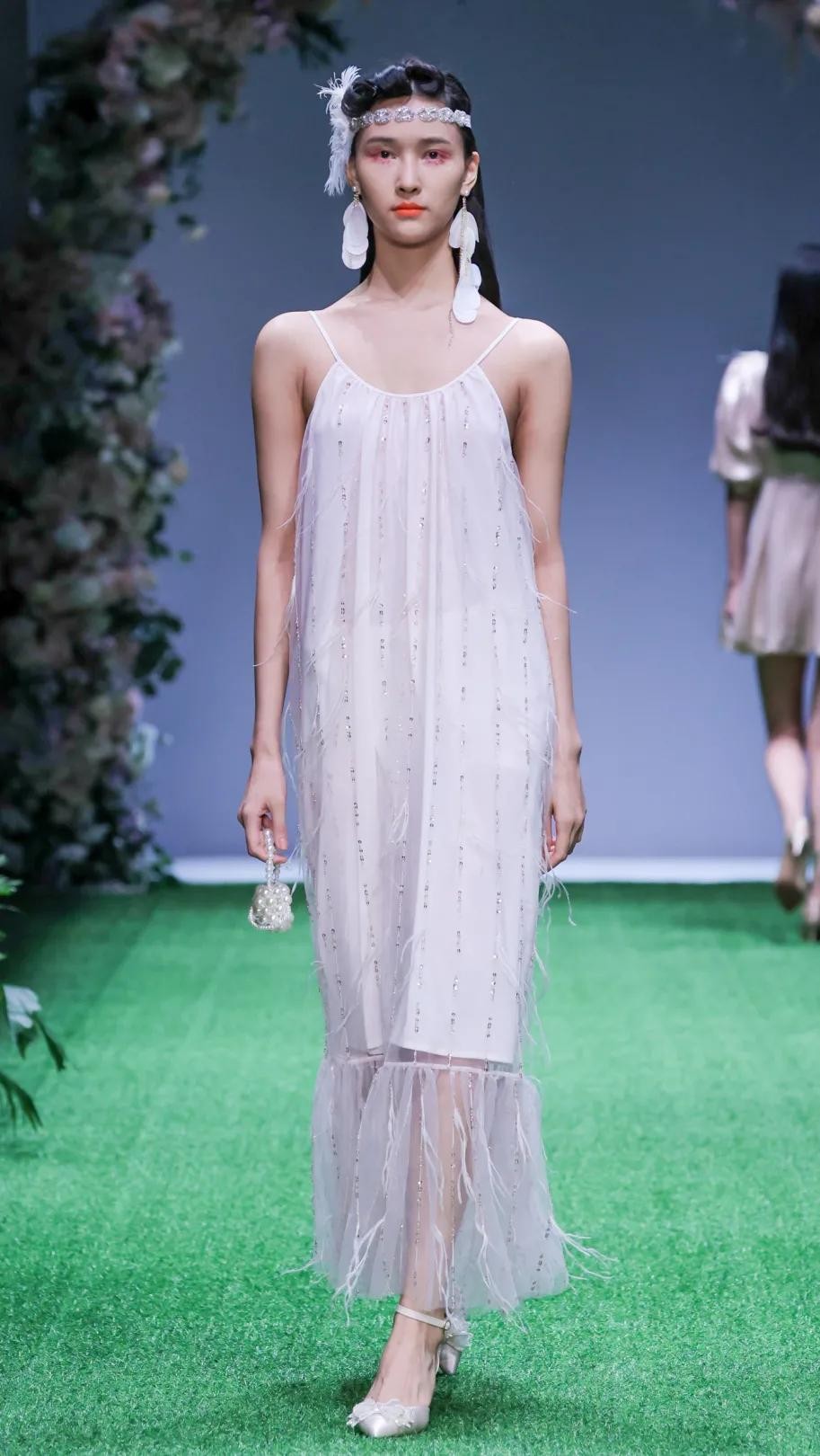 如果你喜欢浪漫,JUMPER ZHANG的设计绝对不容错过。JUMPER ZHANG的设计更倾向于轻礼服,本季应用到羽毛、亮片、水晶以及光泽感较好的绸缎材质,打造出端庄典雅的女性着装和男士正装。秀场地面还铺满了花瓣,浪漫至极。