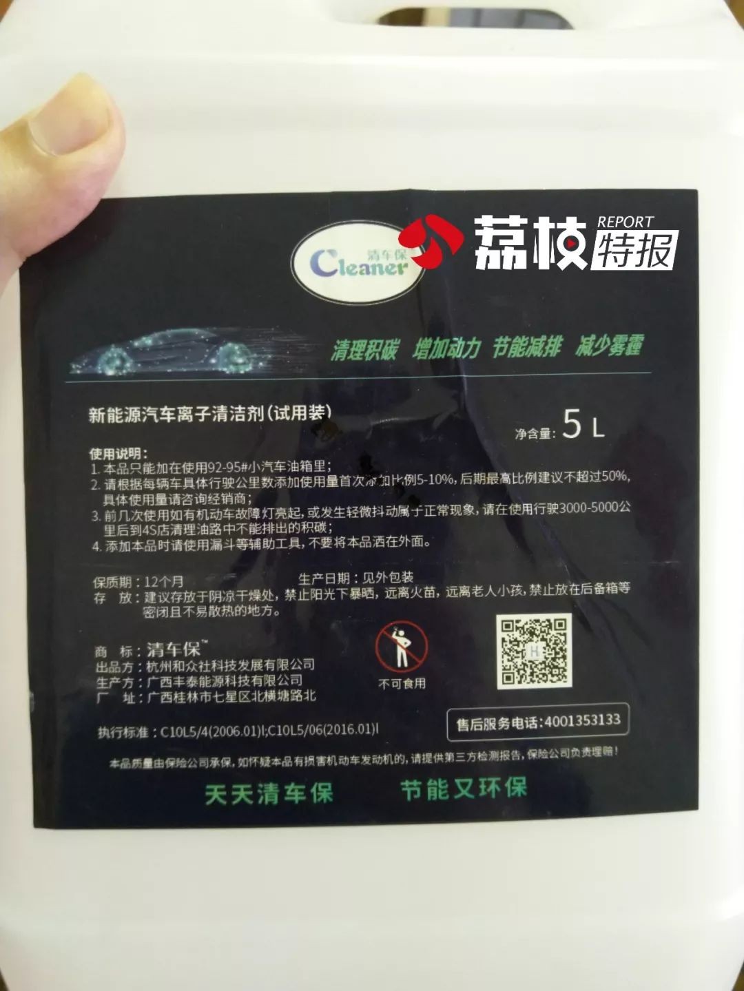 在塑料桶的外包装上可以看到,产品名称是“新能源汽车离子清洁剂”,生产企业为“杭州和众社科技发展有限公司”,产地为广西桂林,没有标明具体成分。